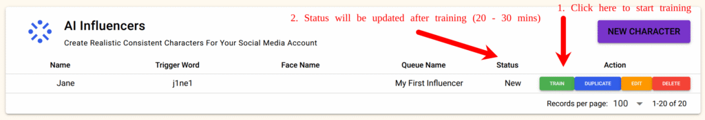 After saving, click the Train button to start training your influencer.