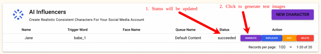 Once training is complete, you’ll see a Generate button next to your influencer.