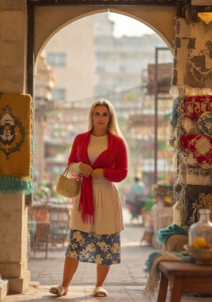 She is exploring a Moroccan souk, wearing red shawl over cream blouse, patterned skirt, carrying woven bag, colorful carpets and spices around, soft dust haze in air, afternoon light filtering through, warm tones