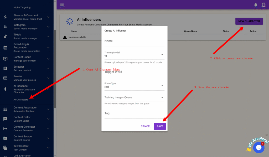 Model Training Imagesand upload the images. - Go to AI Influencer → AI Characters → New Character.